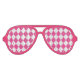 Top off your Mardi Gras outfit with these fun pink sunglasses printed with a pink and white harlequin diamond pattern.