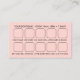 Custom business card featuring peachy pink metallic design with sans-serif typography, and classic reward system on the back for customers to receive something, i.e. discount, free item, etc. Click 'Personalise' to add your company details, including name, type of service, phone number, website, address, qr code with text, store hours, additional info, and reward system on the back.