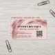Custom business card featuring pink metallic design with sans-serif typography, and classic reward system on the back for customers to receive something, i.e. discount, free item, etc. Click 'Personalise' to add your company details, including name, type of service, phone number, website, address, qr code with text, store hours, additional info, and reward system on the back.