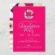 Vibrant pink modern Christmas party invitation. Stylish typography design with burgundy and pink geometric pattern with mistletoe backing.