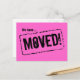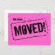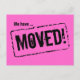Pink moving postcards for your new home address. New house postcards with attention getting colours. Bright pink and black design with rubber stamp print. Custom moving text; We have moved! Add your new address on the back. Modern moving cards for home and business.