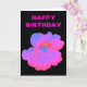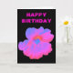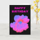 This bright greeting card features a photograph of a Nasturtium flower. The photo has been artificially coloured resulting in a bright pink flower with some blue tones mixed in. The black background provides a lovely contrast. There is customisable pink text above the flower, on the outside of the card, that says "Happy birthday" but can be changed to suit other occasions. The inside of the card is blank.