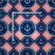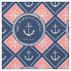 Nautical fabric you can personalize with your family name inside a rope-framed circle against a pattern of anchors and ship's wheels in white against navy blue and pink tiles framed with a rope illustration.
