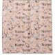 Charming seamless pattern shower curtain featuring the word Nurse with medical essentials like stethoscopes, syringes, medicine bottles, and nurse cups on a soft pink background. This playful healthcare-inspired design blends feminine colours with nursing-themed elements, making it ideal for nurses, nursing students, healthcare workers, and medical professionals.