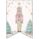 This pastel Nutcracker ballet birthday bunting flag sets the tone for your girl winter wonderland theme birthday celebration. The ODILE Collection has a soft pink background with Nutcracker ballet faves from the Sugar Plum Fairy, the Nutcracker in pastel pink, a rocking horse toy, Christmas tree, wrapped gifts, ballet point shoes, pink poinsettias, and soft mint green winter greenery. Serif font in gold spells out HAPPY BIRTHDAY.