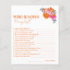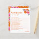 Celebrate the mum-to-be with this pink and orange floral Who Knows Mummy Best game, perfect for a sweet and fun baby girl shower. Featuring vibrant botanical blooms in a cheerful garden party theme, it’s a lovely way to spark laughs and memories. Great for a spring or summer baby shower, this game brings guests together for lighthearted baby shower fun.