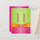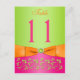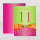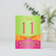 This hot pink, bright orange, and lime green floral table number postcard with an orange FAUX ribbon and peridot and diamond brooch matches the wedding invitation shown below. If you require any other matching items, please email niteowlstudio@gmail.com
