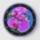 The most arresting and gorgeous pink orchid photo you will ever see, bright pink, prominent veins and water droplets, set against a deep sky blue background, white numbers on black. If you want a floral clock, this is the one to buy. Roy Foos