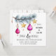The teardrop shape, reminiscent of precious jewels, adds a playful yet elegant dimension to the design of this customisable jingle and mingle party invitation. Two pink teardrop shaped holiday ornament hang from a pine branch along with two golden holiday stars. Add all of your party details on the front. The reverse of the card features an array of pink ornaments hanging from the top of the card with room to add more information for your guests or holidays wishes, Enjoy your party!
