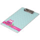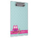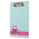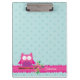 Personalised clipboard featuring a little pink cartoon owl sitting on a branch with green leaves and hot pink flowers. Fun design for girls, customisable name and aqua dots.