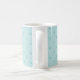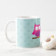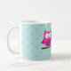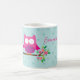 Personalised mug featuring a little pink cartoon owl sitting on a branch with green leaves and hot pink flowers and aqua polka dots. Cute and fun design for for girls. Customisable name gift.