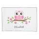 Cute, personalised pillowcase for girls featuring a pink owl sitting on a branch with green leaves and pink flowers. Customisable name or other short text.