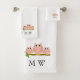 Bath towel set, consisting of a face cloth, hand towel and bath towel with an owl design. You can customise this bath towel set with any text of your choice. Should you require any help with customising then contact us through the message link on this page. Owl design bathroom towel set
