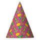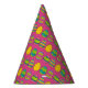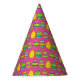 Paper party hat design features an original marker illustration of a row of painted Easter eggs, printed on a pink background.