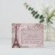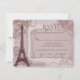 Send guests a simple and elegant Pink Parisian wedding RSVP card. RSVP card design features the Eiffel Tower, a scroll where you can detail the information of your bridal shower adorned with damask and postal stamp embellishments. Additional wedding stationery available with this design as well.