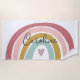 Pink Pastel Boho Rainbow Name Beach Towel in shades of pink, blush, mustard, aqua and lavender features a cute illustration of a boho rainbow.
