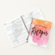 Charming recipe book printed with a watercolor wash in a lovely ombre of pink and peach. Personalise with your name and the year. Recipes is written in a black brush script with a doodled heart replacing the dot over the i.