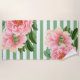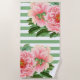Pink Peonies Green Stripes Beach Towel