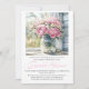 This elegant bridal shower invitation features a soft, romantic floral design centered around a glass mason jar filled with lush pink peonies and delicate white daisies, set against a light-filled window scene with a gentle, airy watercolor style. The muted pastel tones and subtle greenery create a fresh, garden-inspired aesthetic, while the clean white border adds a timeless, refined touch. Classic serif typography is paired with graceful script lettering to highlight the event title, giving the overall design a perfect balance of sophistication and charm—ideal for a feminine, vintage-inspired celebration.