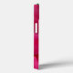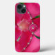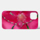 The original photograph by MaeFlowers on this iPhone 13 Case is a closeup of a bright pink flower with petals open wide. A background of green leaves can be seen between the petals. The design of the case is in the style of a floral fabric clutch bag, with a fold over flap outlined in pale pink pearls, and a round shaded pink closure with a pearl in the centre. The flower's centre, near the top of the purse, is a soft yellow ivory blending into pink at its ruffled outer edges.