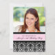 Custom Photo 20th Birthday party invitations in elegant and pretty light pastel blush pink, black and white classic floral damask pattern. Add your name, photo, and party details for a unique and stylish 20th birthday party invitation.