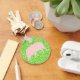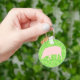 This Keychain features a cartoon style pink pig. It has its head down ready to gobble up whatever food it can find. The background is a mixture of different shades of green to create the impression of grass.