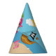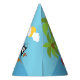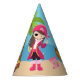 This design on these cute pirate birthday party hats features a pirate girl dressed in pink standing on a beach by a palm tree and a treasure chest full of gold. A pirate ship can be seen in the distance, anchored in the ocean. Some graphics by Pretty Grafik at Mygrafico.com. Some graphics by Zenware Designs at MyGrafico.com http://www.mygrafico.com/zenware-designs/aff_14.html .
