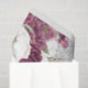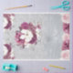 A silver effect tissue paper, with white lace design and arrangements of pink and plum roses and ranunculus.