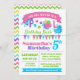 Pool birthday bash invitation, pink, purple, teal, yellow and lime colour scheme suitable for any age. Add your own wording into the template, to more customisation (font colour, font style, background), click on personalise, scroll down and click on link "click to customise further":