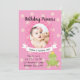 Pink Princess Party Invitation. The front design is a pink polka dot background with a vibrant pink mirror graphic and banner announcing the birthday girl, a frog prince graphic sits at the bottom right of the invite. The back is a simple pink striped pattern.