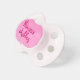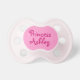This personalised custom pacifier for baby girls says "Princess Ashley." It's darker letters on a pink background.