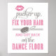 "Pucker Up, Fix Your Hair and Get Back on the Dance Floor" vintage style wedding poster sign to display in the women's bathroom. Lipstick print and hairbrush accents. Bright pink and pewter gray color scheme on white background.