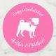 Include the big brother or sister fur baby in the celebration with this adorable pug dog baby shower design! Perfect for a puppy lover with a baby on the way. The pug is next to an adorable vintage carriage. The pink background makes it perfect for a baby girl! Also a great design for a puppy shower!
