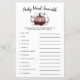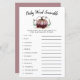 Rustic pumpkin theme baby shower baby word scramble game card featuring illustration of a pink pumpkin with faux gold glitter. The list of words on this card are all related to babies and they are scrambled. The guests are going to compete who can unscramble all of them first! ANSWER KEY: 1. car seat 2. milk 3. playpen 4. pacifier 5. diaper 6. rocking chair 7. nursery 8. baby monitor 9. swaddle 10. formula 11. rubber ducky 12. stroller.