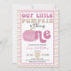 Celebrate your little girl's first birthday with this adorable “Our Little Pumpkin” invitation in cheerful shades of pink! Featuring a watercolor pink pumpkin, playful retro fonts, and a fun chevron border, this design is perfect for a fall-themed or Thanksgiving weekend party. Personalise with your child’s name and party details to create a festive and memorable fall celebration keepsake.