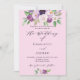 A pink background. Decorated with purple watercolored flowers and greenery. Personalise and add your names and party details.