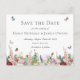 Pretty, summery and classic, this Save the Date postcard features a lovely design of pink and purple flowers with butterflies and bumble bees flying around.