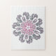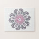 The design on this puzzle is a fractal art kaleidoscope. The swirled design is pink, purple and gray on a white background.