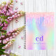 A trendy holographic coloured background with pastel colours in pink, purple, mint green. Decorated with drips in pink and purple. Personalise and add your monogram initials and name. Purple coloured letters. A notebook for taking notes, school, homework, diary, journalling.