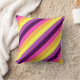 A 16” x 16” throw pillow featuring a cute, colourful pattern design of diagonal stripes in plum purple, lavender, lemon yellow, melon orange, and bright magenta.