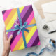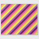 A roll of wrapping paper featuring a cute, colourful pattern design of diagonal stripes in plum purple, lavender, lemon yellow, melon orange, and bright magenta.