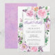 Purple and pink roses and peonies with purple and white lilacs create a lush frame on this bridal brunch and bubbly invitation. The back is a unique pink and purple watercolor texture with just the hint of rose outlines. All of the text can be easily edited to create a personal remembrance.