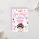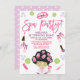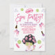 Sweet spa party themed birthday invitation for a little girl featuring a brown hair girl, slippers, comb, nail polish, cucumber slices and more. This spa party themed birthday invitation also features a modern calligraphy heading.