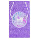 This gift bag features a cute unicorn design with faux purple glitter background. Personalise it with a name.