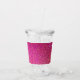Pretty white unicorn face on front of tumbler and she has pastel rainbow hair and flowers. Background is designed with pink faux glitter sparkles around the mug. Personalized with name in black calligraphy script lettering on the front vertical to the unicorn.