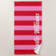 Beach towel featuring your name in a white, retro font over bold, red and pink, horizontal stripes. All colours are customisable.