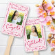 Stay cool while supporting your favorite grad as they receive their diploma with this quirky, whimsical, simple, modern keepsake 2 photo hand fan. Fun pink red handwritten script typography and hand drawn graduation icon sketch doodles overlay a light pink background. The copy “congrats” and photo 1 are on the front, the word “graduate” and photo 2 are on the back. Personalize the custom text with your graduate’s name, school and class year. Matching invites, thank you cards, stickers, banners, yard signs and other graduation goodies are also available in this trendy and playful collection. Guaranteed to preserve cherished memories of their special occasion!