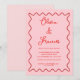 This elegant wedding invitation exudes timeless charm with its soft pink and rich red hues, creating a beautifully romantic atmosphere. The vintage bow at the centre adds a touch of classic elegance, while the wavy frame enhances the overall design with a graceful, flowing appearance. Perfectly suited for couples seeking a blend of traditional and modern styles, this invitation will captivate your guests with its delicate yet sophisticated aesthetic. The combination of soft tones and intricate details makes it ideal for a wedding that celebrates love, refinement, and the beauty of vintage-inspired design.