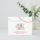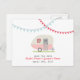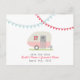 A vintage inspired wedding save the date postcard featuring an illustration of a pink retro trailer with window box of colourful flowers. Red and blue bunting at top. Personalise the text with your information.