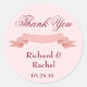 This sheet of pink ribbon thank you stickers features "Thank You" in a red cursive font. The pink ribbon is in the middle with the name and date underneath.